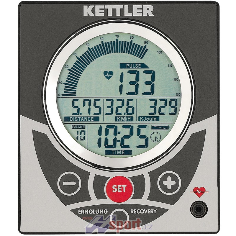 - Tréninkový počítač. Přehledný displej se 6 permanentně zobrazenými funkcemi měří čas, rychlost, tréninkovou vzdálenost, puls, frekvenci šlapání a spotřebu energie. Optická i akustická signalizace při překročení horní hranice pulsu spolu se zobrazením procentuálního údaje. Možnost předvolby cílových hodnot pro čas, vzdálenost, spotřebu energie a kardiozóny (Fat/Fit/manual).
