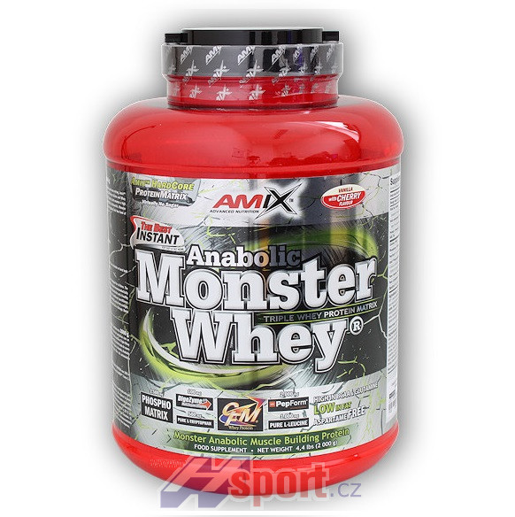 Unikátní protein, pro který je typická výborná chuť a velice rychlá rozpustnost. Obsahuje 80% čistého proteinu, složeného z Triple Whey Matrixu (syrovátkový koncentrát, CFM syrovátkový isolát a syrovátkový hydrolyzát), micelárního kaseinu a aminokyselin derivovaných z hovězího proteinového isolátu. Tento vyvážený komplex zajišťuje vysokou biologickou hodnotu s vysokým obsahem nejdůležitějších aminokyselin BCAA & L-Glutaminu. Amix™ Monster Whey Protein navíc obsahuje unikátní složku Pep-Form™ (peptidy leucinu) a volnou formu L-leucinu pro znásobení anabolického efektu. Amix™ Monster Whey Protein nepřetržitě udržuje vaše svaly naplněné esenciálními aminokyselinami, které jsou potřebné pro růst pevných a silných svalů. Amix™ Monster Whey Protein také pomůže zastavit katabolické procesy a nastartovat proteinovou syntézu ve vašem těle.