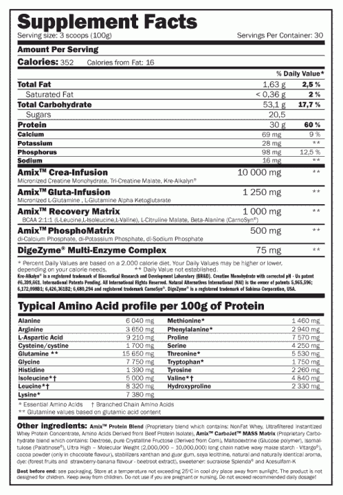 Složení ve 100 g: maltodextrin, odtučněná syrovátka /z mléka/, hydrolyzovaný hovězí protein, kreatin monohydrát 8000 mg, ultrafiltrovaný syrovátkový bílkovinný koncentrát /z mléka/, kakaový prášek (pouze pro příchuť čokoláda), amylopektin ječný škrob Vitargo® 2500 mg, Isomaltulosa (Palatinose®) 2500 mg, Tri-kreatin malát 1500 mg, zahušťovadla: xantan a guma guar; dextróza, fruktóza, L-Glutamín 1000 mg, emulgátor: sójový lecitin; hydrogenfosforečnan vápenatý 750 mg, Kre-Alkalyn® 500 mg, přírodní a přírodně identické aroma, L-Leucin 250 mg, L-Glutamin Alfa Ketoglutarát 250 mg, Beta-Alanin 250 mg, L-Citrulin 250 mg, L-Isoleucin 125 mg, L-Valin 125 mg, hydrogenfosforečnan draselný 125 mg, hydrogenfosforečnan sodný 125 mg, extrakt z červené řepy (pro příchuť lesní plody a jahoda-banán); multienzymový komplex DigeZyme® 75 mg (amyláza, celuláza, laktáza, lipáza, bakteriální neutrální proteáza), sladidla: sukralosa (Splenda®), acesulfam-K