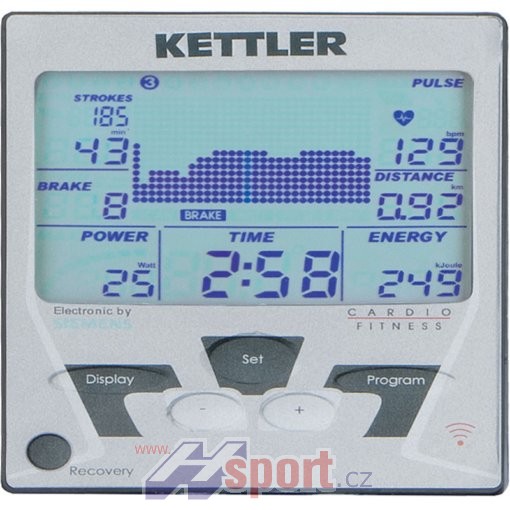 - Tréninkový počítač. Přehledný LCD displej značky SIEMENS s 8 permanentně zobrazovanými funkcemi. Měří čas, tréninkovou vzdálenost (včetně celkového počtu naveslovaných km), puls, průměrný a maximální výkon, frekvenci záběrů (s akustickým signálem), celkový počet záběrů a spotřebu energie. Optická i akustická signalizace při překročení horní hranice pulsu spolu se zobrazením procentuálního údaje. Vyhodnocení vydýchávacího pulsu včetně stanovení kondiční známky 1–6. Po skončení tréninku se zobrazují průměrné tréninkové hodnoty. Možnost nastavení frekvence akustického signálu pro udávání tempa přítahu.