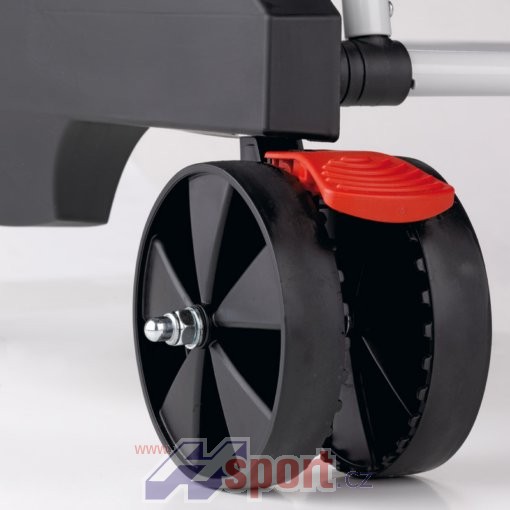 Zdvojená výkyvná kolečka podvozku s gumovým povrchem a nadprůměrně širokým profilem jsou po diagonále vybavena brzdami pro vyšší stabilitu při hře i v přepravní poloze.