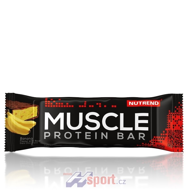 MUSCLE PROTEIN BAR-příchuť banán – škrobový sirup, poleva kakaová tmavá (cukr, rostlinný tuk, kakaový prášek, sušená syrovátka, barvivo aktivní uhlí, emulgátor sójový lecitin, přírodně identické aroma vanilka), izolát sojových bílkovin, syrovátkový koncentrát, invertní sirup (cukr, voda, konzervant kyselina sorbová), sójové vločky, palmový tuk, vanilková náplň (cukr, směs ztužených rostlinných tuků a rostlinných olejů, sušená syrovátka, sušené mléko, emulgátor řepkový lecitin, aromatické látky, ethylvanilin, jedlá sůl, antioxidant tokoferol), kukuřično-bramborový extrudát (kukuřičná krupice, sušená bramborová kaše, cukr, vláknina), sacharóza, emulgátor řepkový lecitin, laurový tuk, zahušťovadlo guarová guma, přírodně identické aroma smetana, přírodně identické aroma banán, multivitaminový premix (vitamíny E, B1, B6, B2, B12, B3, B5, H, C a kys. listová), konzervant kyselina sorbová.